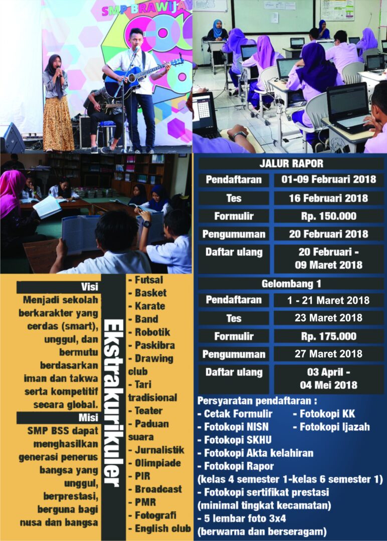 Penerimaan Peserta Didik Baru SMP BSS Umar Faruq, M.Kom. Posted on 21/12/201727/07/2020 653 Views Penerimaan Peserta Didik Baru (PPDB) SMP Brawijaya Smart School (BSS) Malang Tahun Ajaran 2018/2019 sudah dibuka, info lebih lanjut dapat dilihat pada brosur dibawah ini: