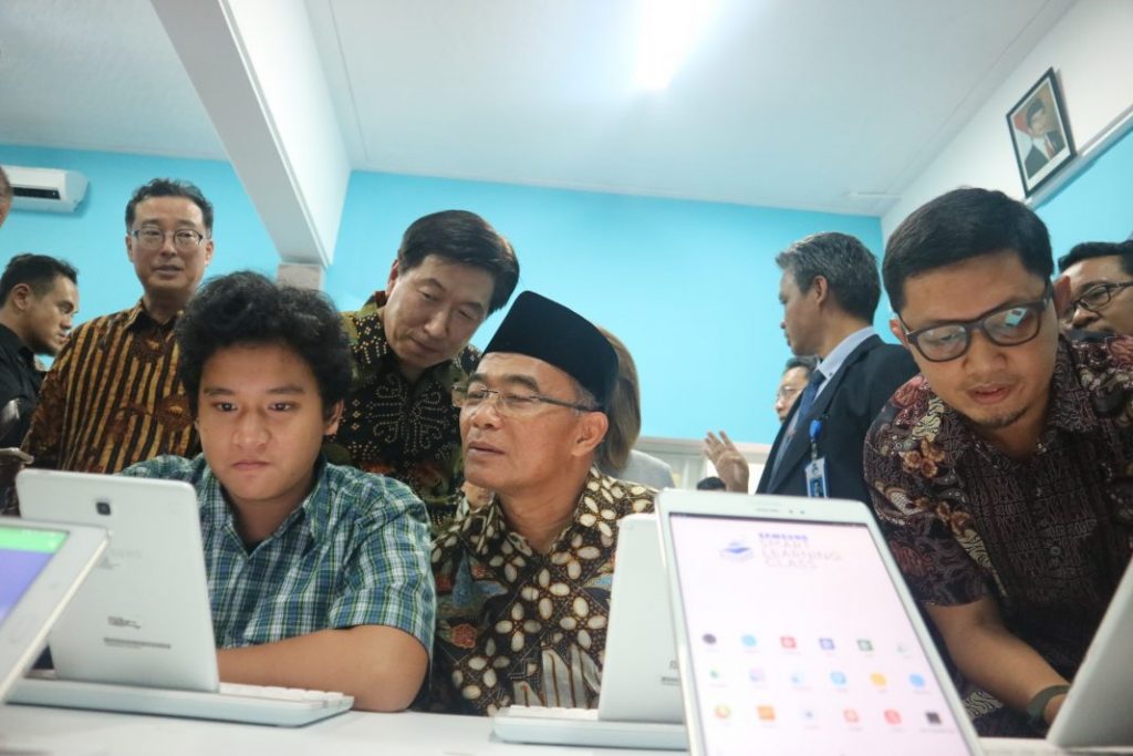 Peresmian SSLC yang dilakukan Menteri Kebudayaan dan Pendidikan (Mendikbud) Prof Dr Muhadjir Effendy MAP di SMA Pangudi Luhur Jakarta Selatan Selasa (20/3). Fasilitas kelas digital tersebut juga diberikan kepada tiga sekolah lain di tiga provinsi berbeda. Yakni, Brawijaya Smart School Malang, SMA Plus Negeri 17 Palembang, dan SMA Islam Al-Azhar 12 Makassar. Kelas yang memiliki fasilitas digital lengkap tersebut merupakan bagian dari kampanye kepedulian Samsung terhadap dunia pendidikan.