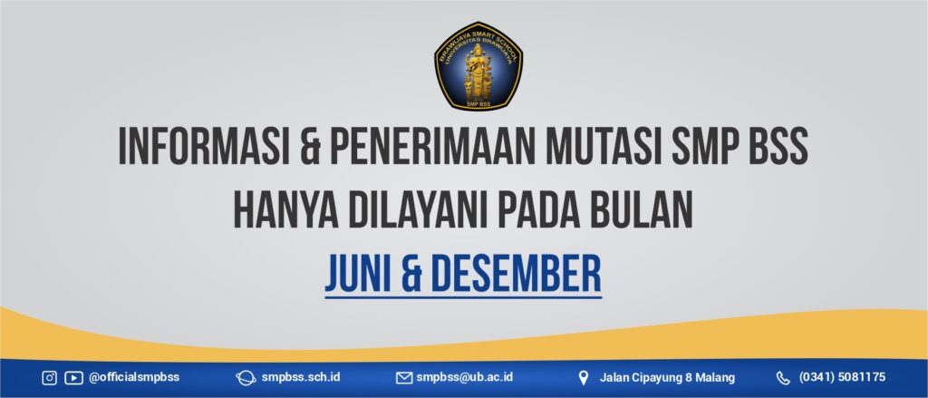 Informasi Penerimaan Mutasi Umar Faruq, M.Kom. Posted on 21/09/202011/05/2025 243 Views Informasi dan Penerimaan Murtasi SMP BSS hanya dilayani pada bulan Juni dan Desember